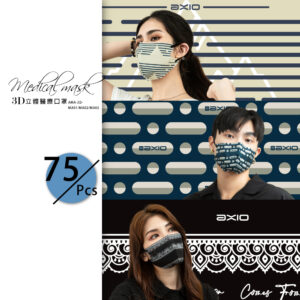 AXIO 3D立體醫療口罩-成人75入/共三盒25入(調節扣可調整耳帶鬆緊)Group-卡其條紋+藍條紋+蕾絲黑-各一盒