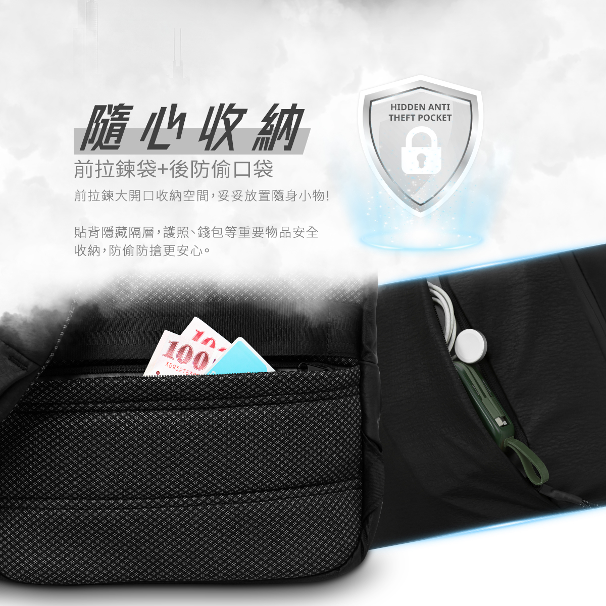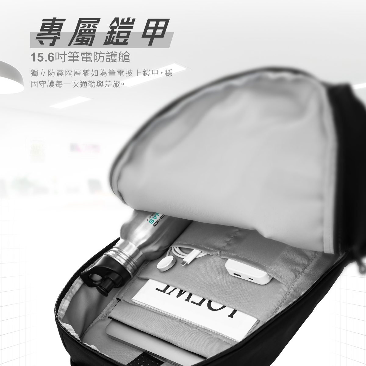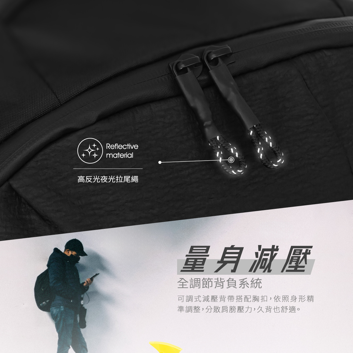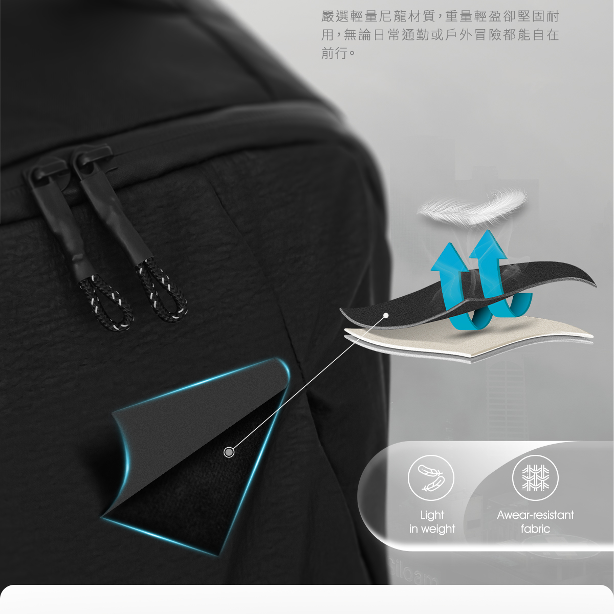 以專屬尼龍輕機能布料打造,減輕負重同時保持結構挺立;15.6 吋筆電獨立隔層、防水尼龍拉鍊與隱形防偷隔層,讓你的日常與旅途兼具風格與安全。
